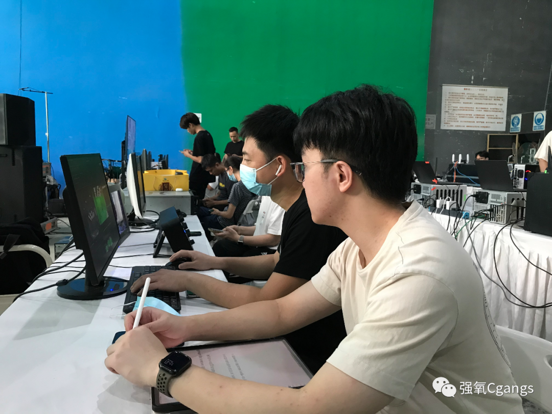工作人员正在讨论虚拟场景制作