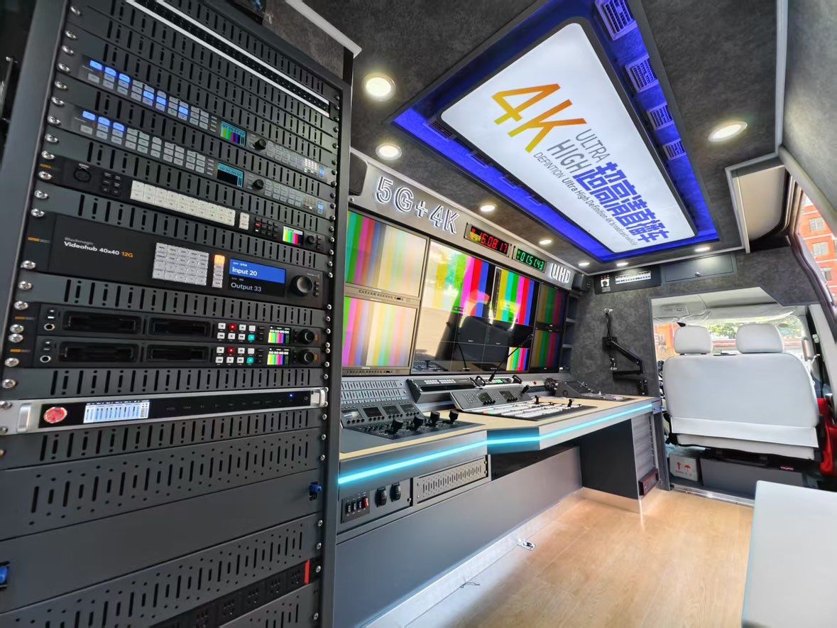 直播车内集成了先进的音视频采集、编辑与传输系统,其中包括Blackmagic URSA Broadcast G2、URSA Studio Viewfinder G2、Blackmagic Videohub 40x40 12G、ATEM Camera Control Panel、ATEM 2 M/E Constellation 4K、ATEM 2 M/E Advanced Panel 20、HyperDeck Studio4K Pro、Teranex AV等,为各类大型活动的直播制作提供了强有力的技术支撑。