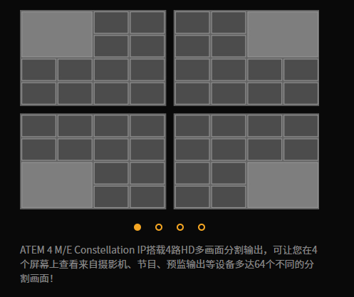 ATEM 4 M/E Constellation IP搭载4路HD多画面分割输出,可让您在4个屏幕上查看来自摄影机、节目、预监输出等设备多达64个不同的分割画面!