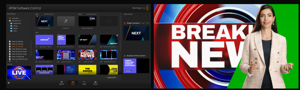 切换台自带的媒体池能存储广播级品质的RGBA图文和动画素材,并可通过4个媒体播放器即时播放。媒体播放器会在ATEM Constellation上显示为额外输入源,因此您无需为图文使用其他输入。内置媒体池能保存图文供媒体播放器使用,能保存60张静帧和最高400帧动画。动画图形非常适合用作Stinger!只要使用ATEM Software Control软件控制,或使用ATEM Photoshop插件直接从Photoshop下载,就能轻松管理所有媒体文件。