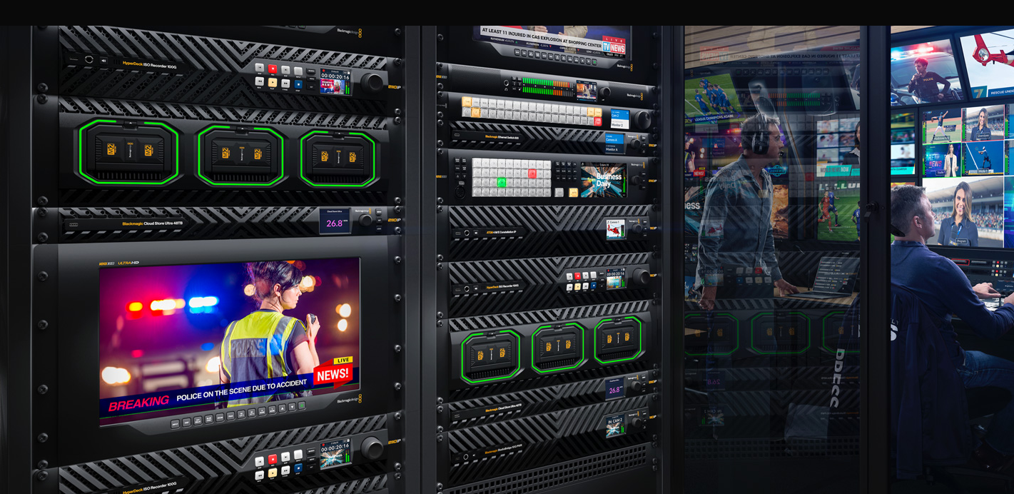 HyperDeck ISO Recorder 100G专为现场制作设计,能够同时将8台摄影机以ProRes文件格式录制在网络存储上。这些录制内容随后可通过DaVinci Resolve进行剪辑,或在实时重播中使用。此外,它还配备冗余100G以太网端口用于SMPTE-2022-7。
