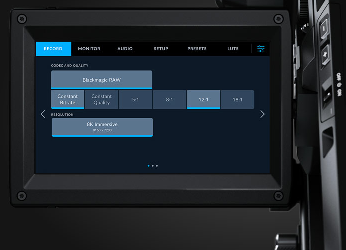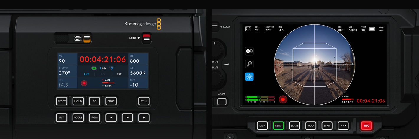 Blackmagic URSA Cine Immersive的大尺寸5英寸HDR触摸屏搭载平视显示器,即HUD,专为沉浸式视频取景、