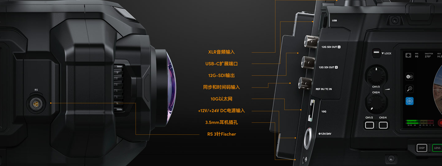 URSA Cine搭载类型广泛的行业标准接口,因此非常适合用于高端电影制作。机身前方设有3针Fischer接口,可实