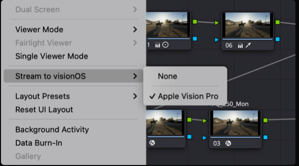 您可以从剪辑、调色或交付页面直接流式传输到Apple Vision Pro,前往“工作区”菜单,选择