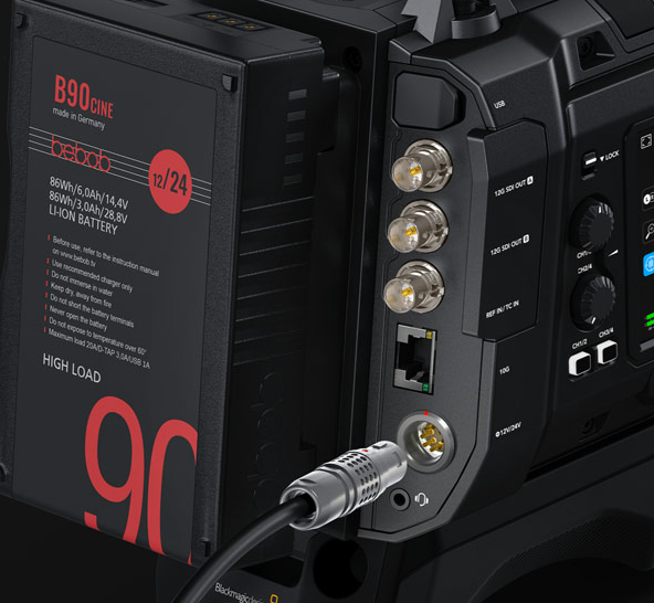 URSA Cine摄影机的后侧包含一个8针Lemo电源连接器,可使用24V电源。这意味着您可以通过现有电源、电池和