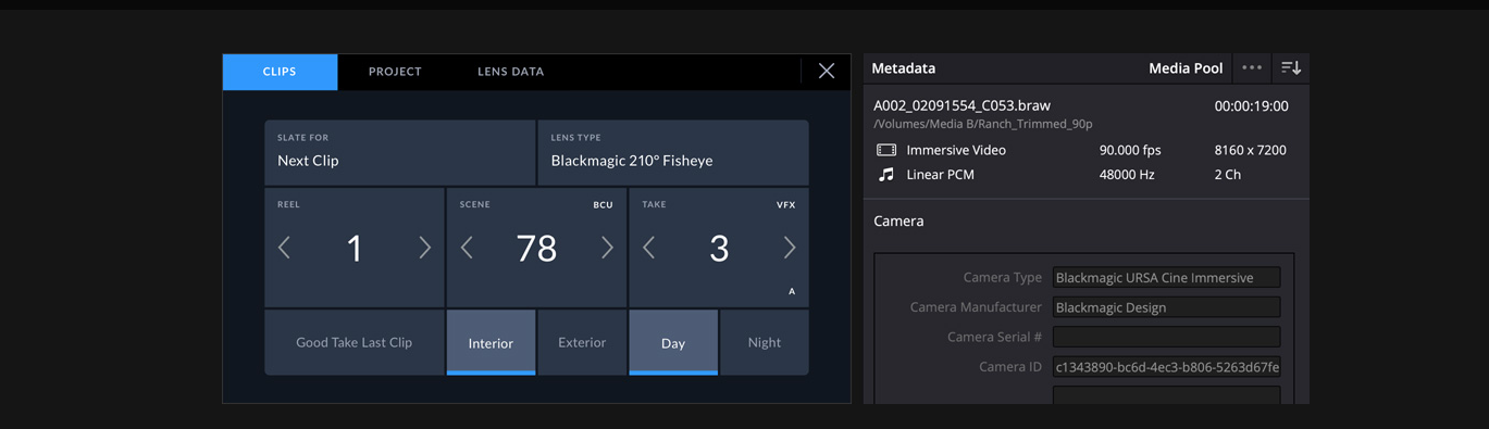 URSA Cine Immersive的Blackmagic RAW文件可存储摄影机元数据、沉浸式镜头投射数据、白平衡、数字场记板