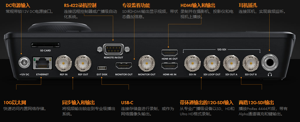 先进的HyperDeck Shuttle 4K Pro型号搭载新的12G-SDI视频接口。12G-SDI采用多速率技术,单个接口可连接SD、HD和Ultra HD设备。标清格式支持NTSC和PAL。720p HD格式支持720p50和59.94p。1080i HD隔行格式支持1080i50和1080i59.94。1080p HD电视格式支持1080p23.98、24、25、29.97、30、50、59.94和60p。HyperDeck Shuttle 4K Pro甚至还可以处理1080 PsF格式!12G-SDI还可以处理2160p23.98、24、25、29.97、50、59.94和60p在内的各种Ultra HD电视格式。在3G-SDI速率下工作时,还支持A级和B级。
