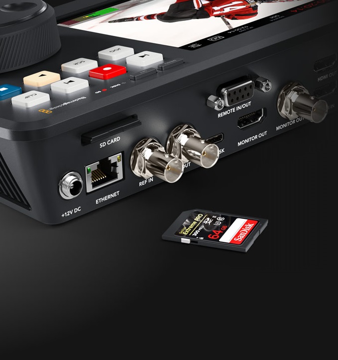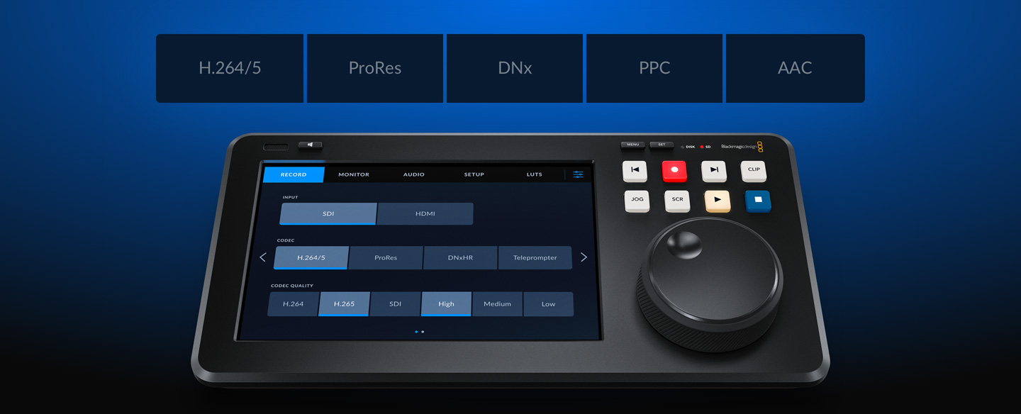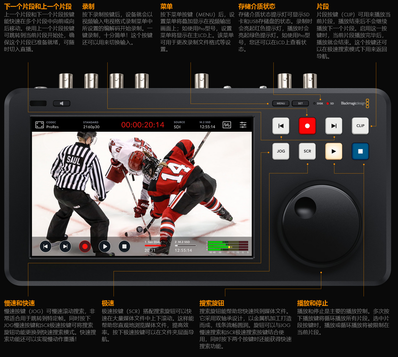 采用台式设计的录制设备,搭载大尺寸搜索旋钮,可快速搜索并播放片段,还可作为媒体播放器与ATEM Mini搭配使用!支持在SD/UHS-II卡或USB存储盘上录制H.264、ProRes或DNxHD文件。