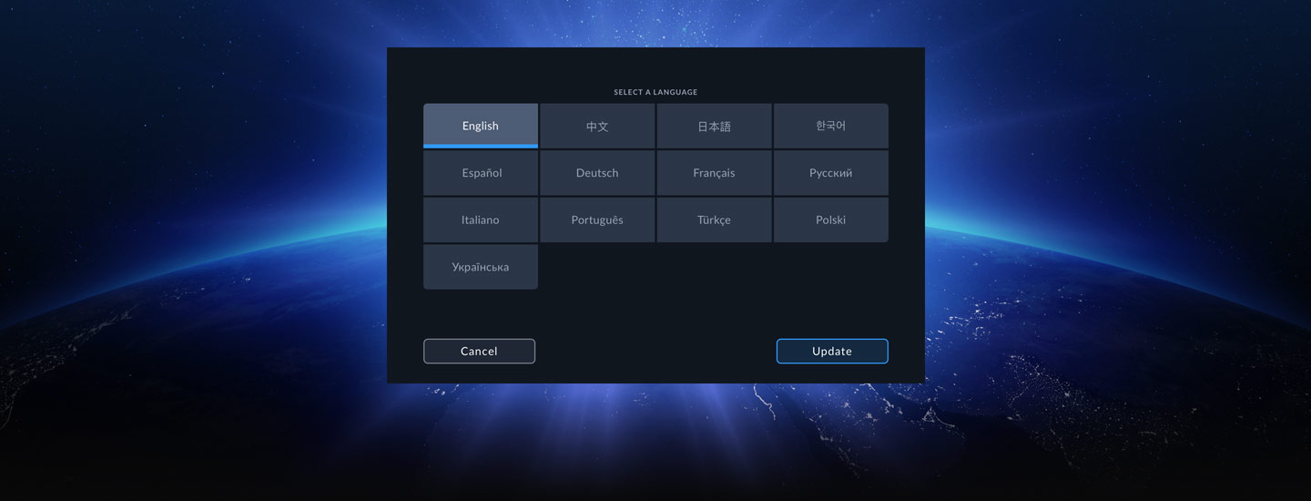 这款产品全面支持多语种操作,让您从此突破语言屏障!支持的语种包括英语、中文、日语、韩语、西班牙语、德语、法语、俄语、意大利语、葡萄牙语以及土耳其语。首次开机时,HyperDeck Shuttle会显示菜单提示您选择语种,您也可以根据需要随时使用菜单切换语种。选定后,屏幕上显示的叠加文字会更改到相应语言显示,而SDI监看输出画面上的所有菜单和叠加显示也会更改到所选语种。这意味着,任何国家和地区的制作团队都能顺利使用HyperDeck!